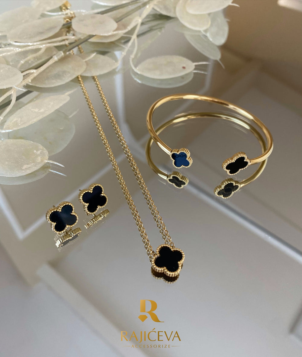 Sefora crno-zlatni set sa detelinama-ogrlica, narukvca sa dve deteline i minđušice.