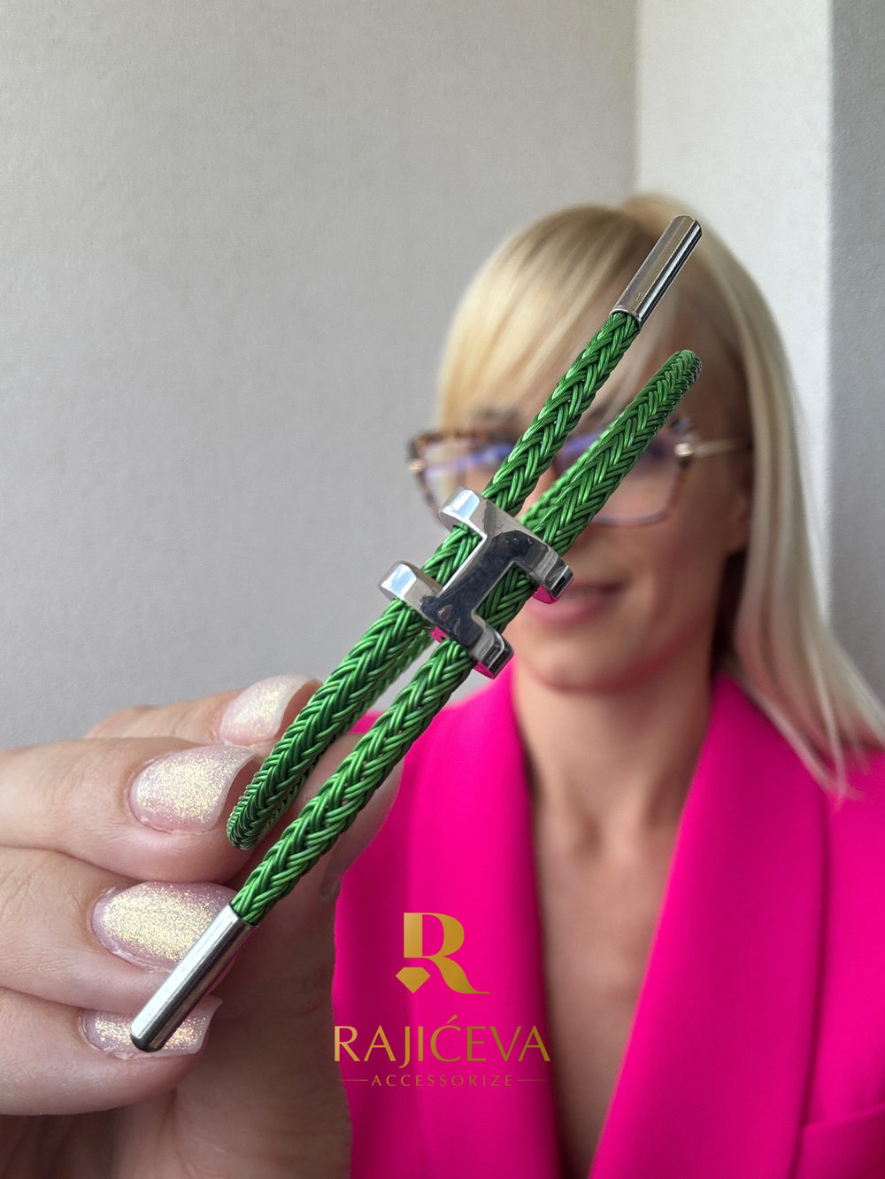 Lora narukvica u zelenoj boji sa srebrnim detaljima.