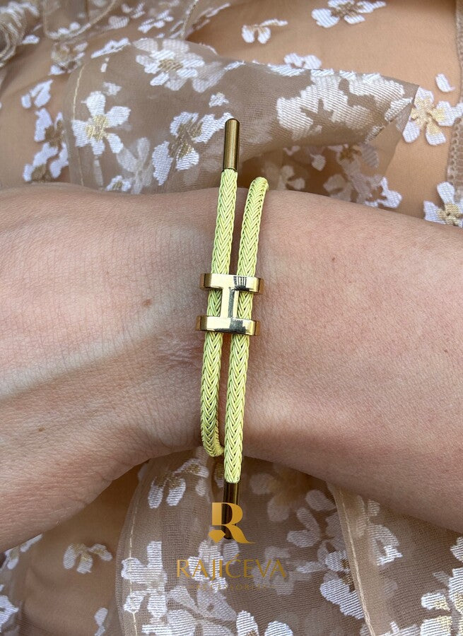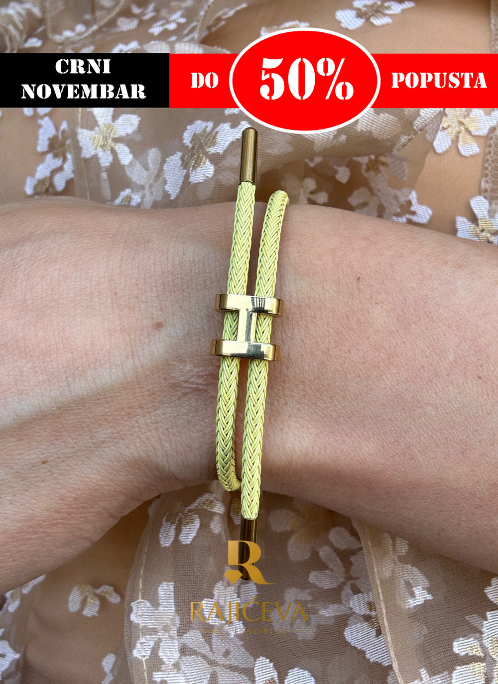 Lora narukvica u žutoj boji sa zlatnim detaljima.