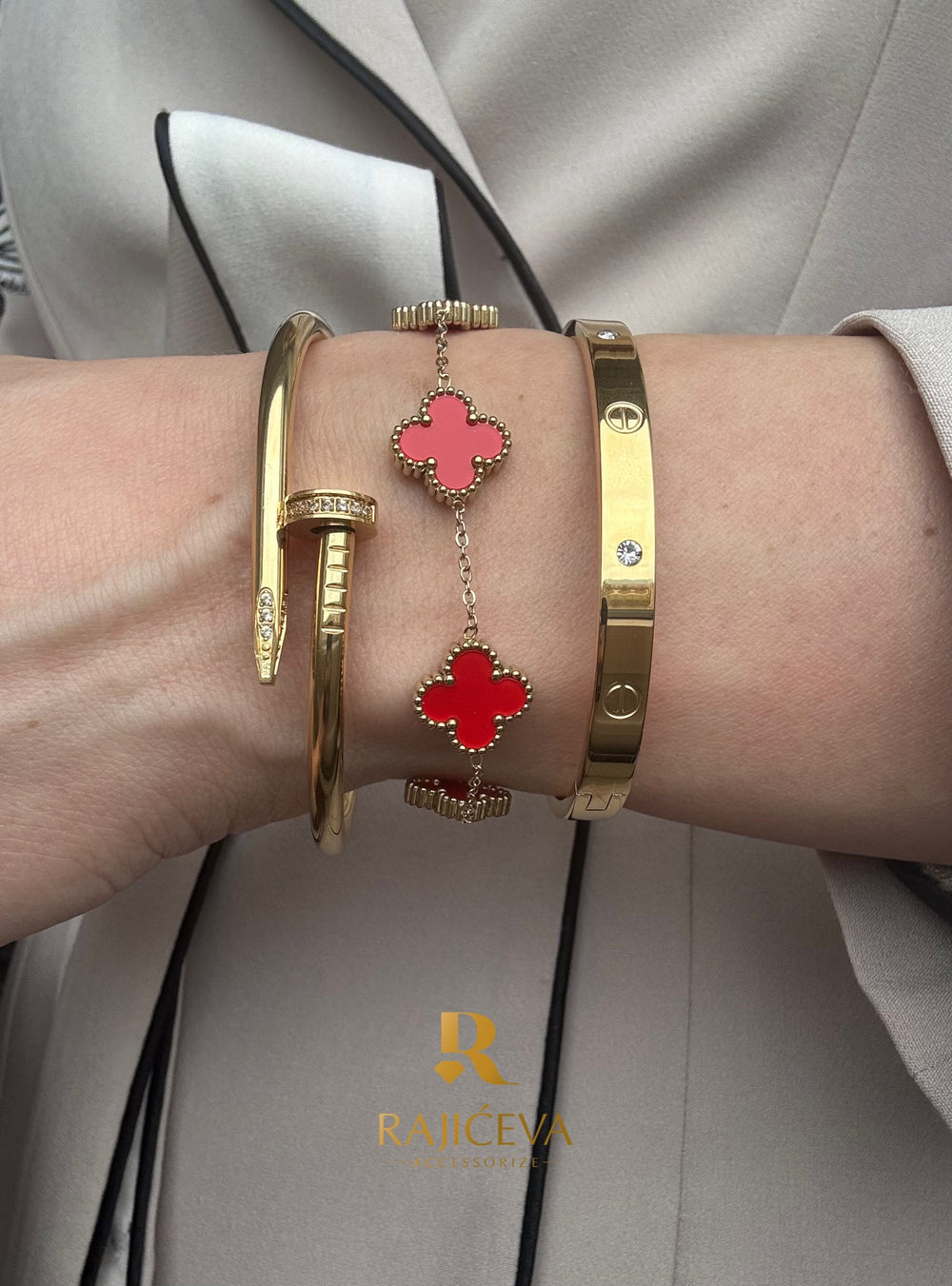 Set od tri Rajićeva narukvice - Love, Ekser i Sefora sa dve deteline u sedefastoj boji.