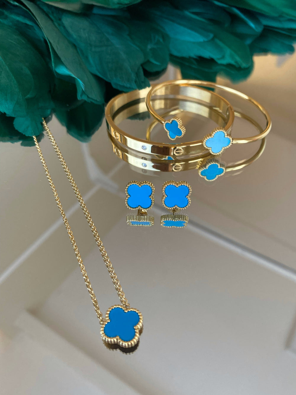 Sefora plavo-zlatni set sa detelinama-ogrlica, narukvca sa dve deteline i minđušice + Love narukvica od nerdjajućeg čelika.