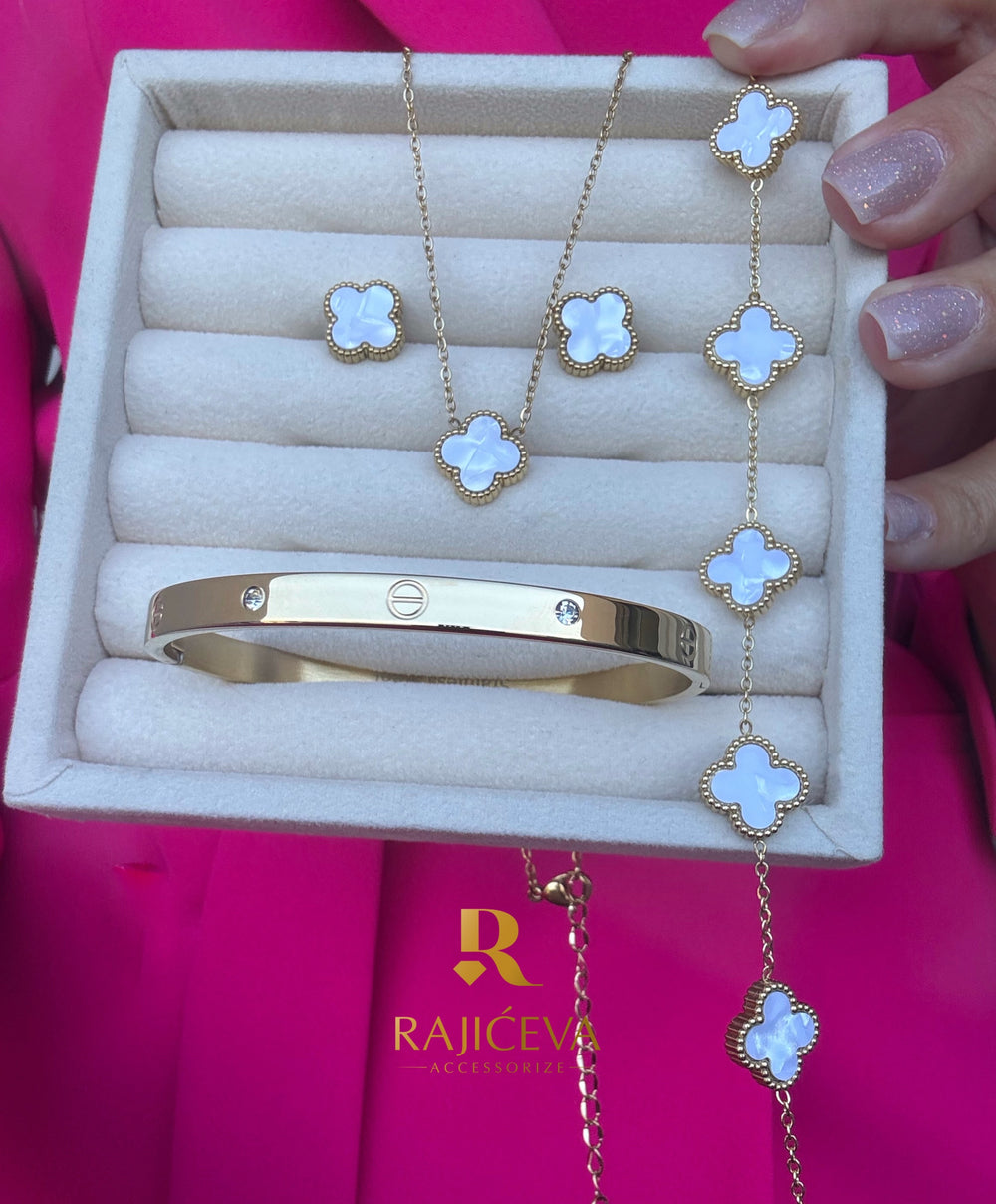 Sefora sedef-zlatni set sa detelinama-ogrlica, narukvca sa pet deteline i minđušice.