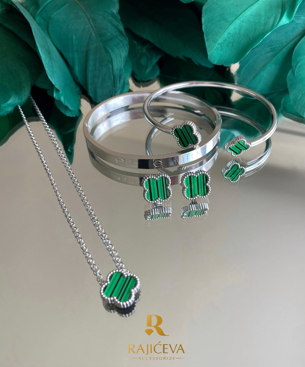Sefora zeleno-srebrni set sa detelinama-ogrlica, narukvca sa dve deteline i minđušice + Love narukvica od nerdjajućeg čelika.