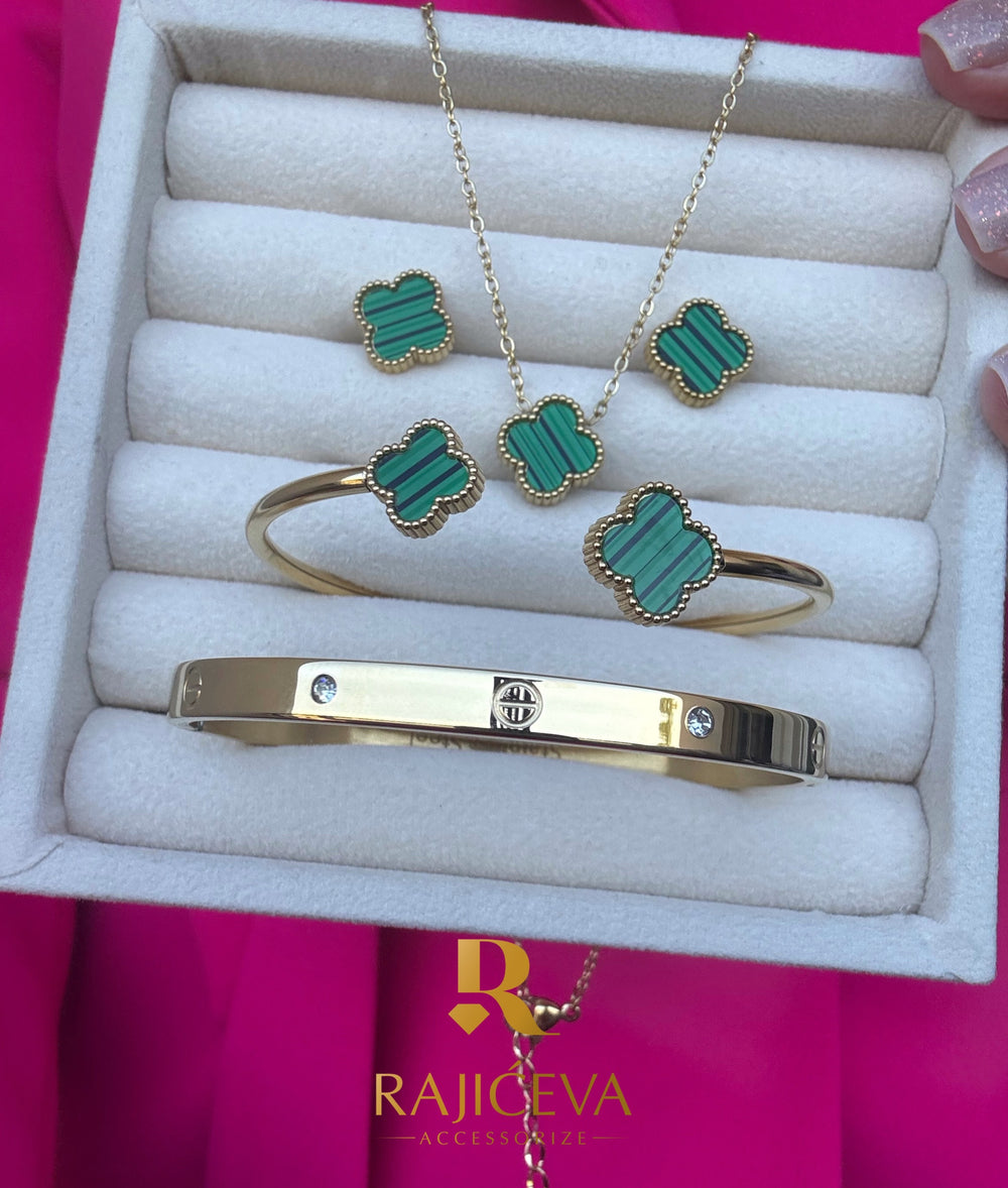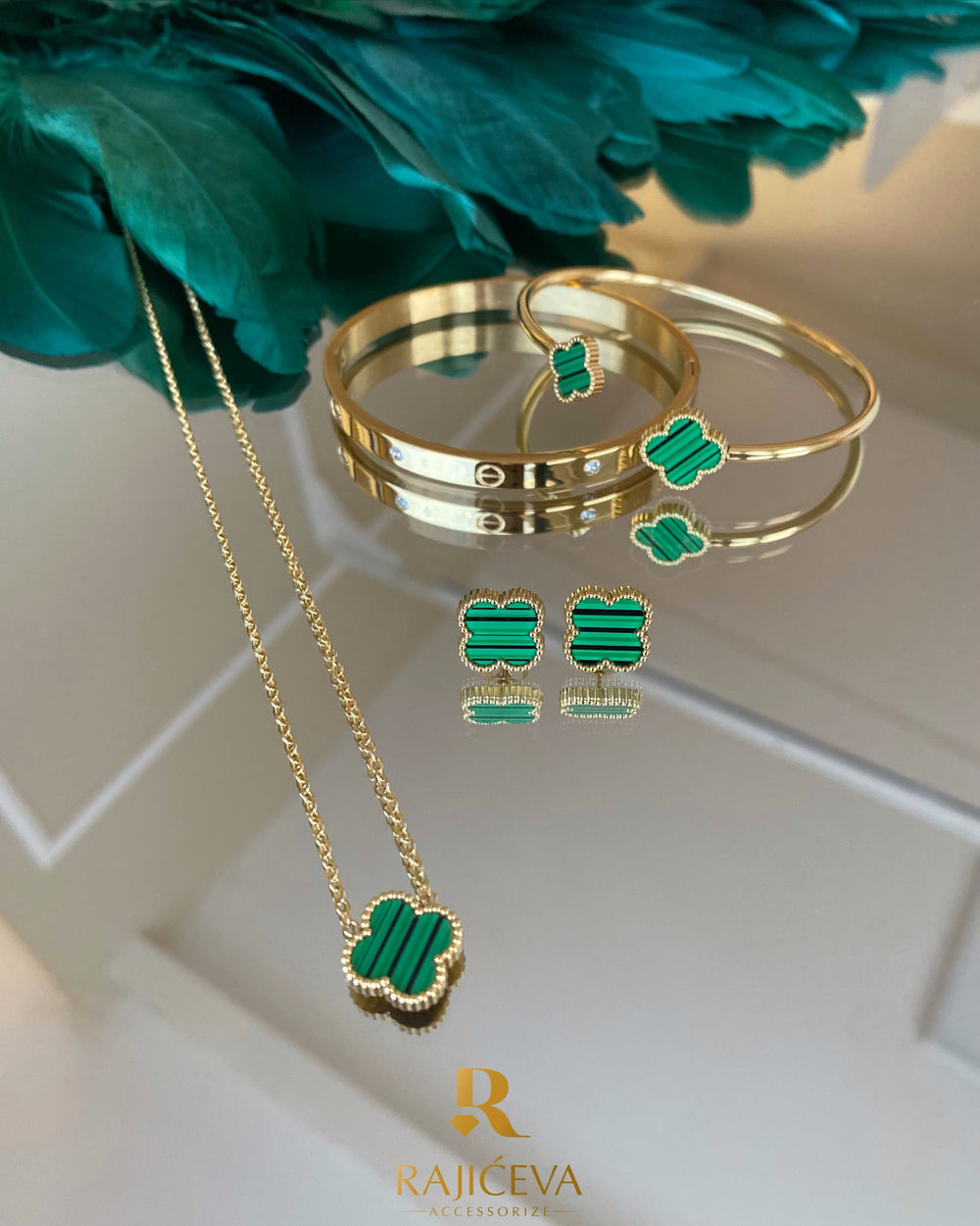 Sefora zeleno-zlatni set sa detelinama-ogrlica, narukvca sa dve deteline i minđušice + Love narukvica od nerdjajućeg čelika.