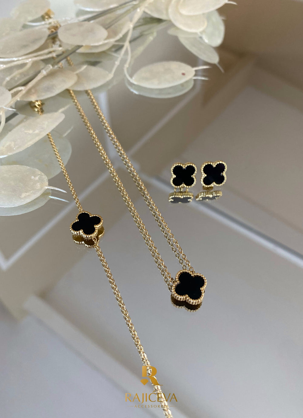 Sefora crno-zlatni set sa detelinama-ogrlica, narukvca sa jednom deteline i minđušice.